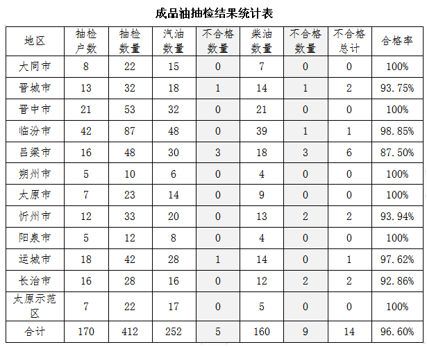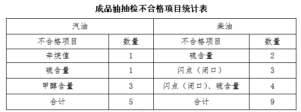 全省共抽查检验170户成品油经营企业(加油站),计412批次车用汽柴油。经检验,合格398批次,不合格14批次,合格率为96.60%。其中,抽检汽油252批次,合格247批次,不合格5批次,合格率为98.02%;抽检柴油160批次,合格151批次,不合格9批次,合格率为94.38%。